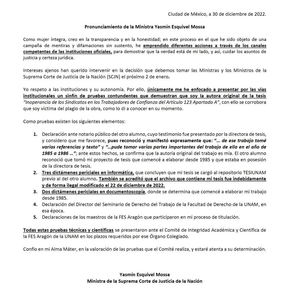 Hace una hora la ministra de la Suprema Corte, Yasmín Esquivel, anunció que emitiría un pronunciamiento por el caso de plagio de su tesis de licenciatura. Pasó una hora y ya salió el comunicado: que es inocente y que se va a defender para probar que ella es la autora de esa tesis.