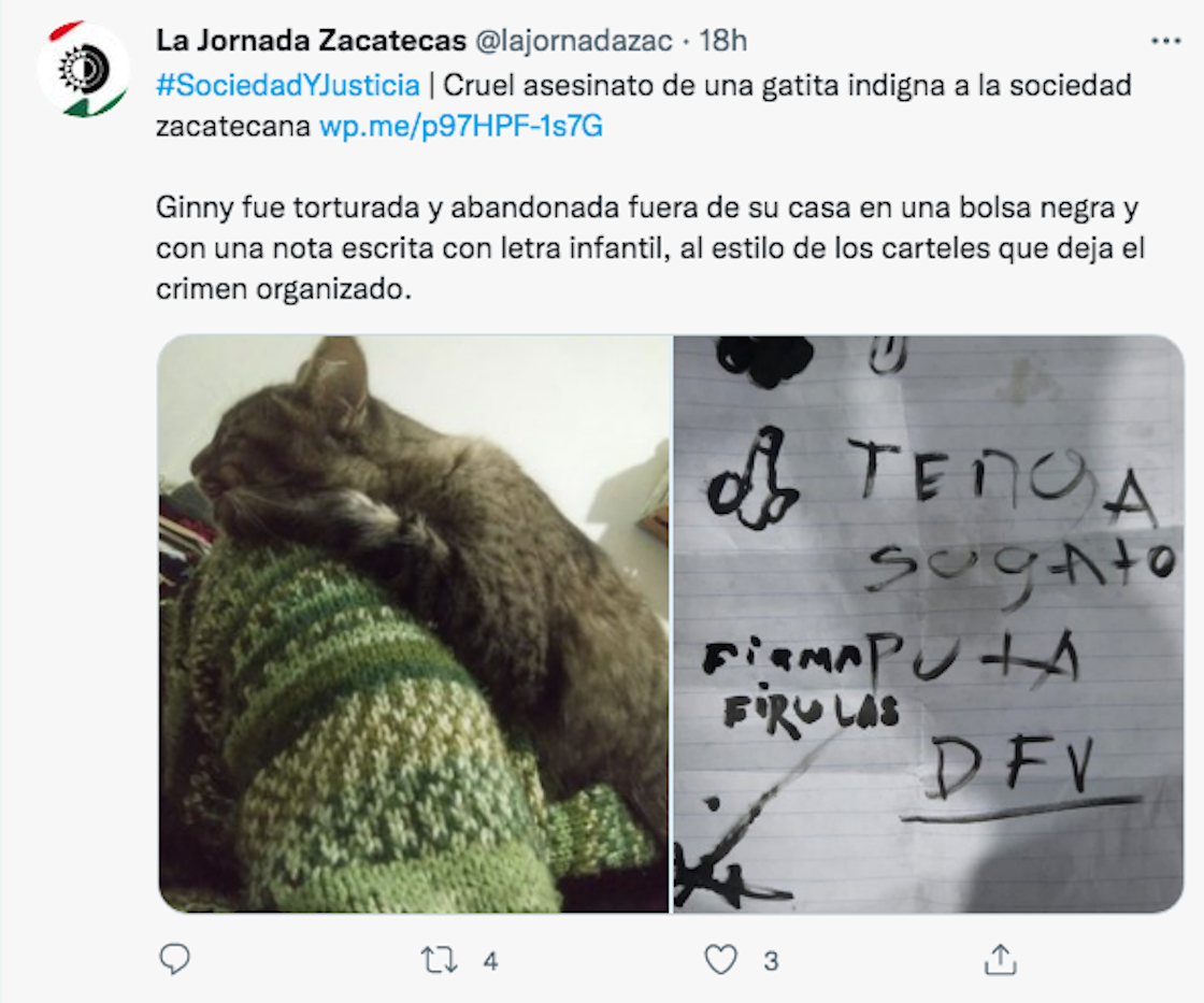 Además de que la gatita fue torturada, su cuerpo fue hallado en una bolsa, afuera de casa y con el mensaje que les platicamos —copiando el modus operandi del crimen organizado.