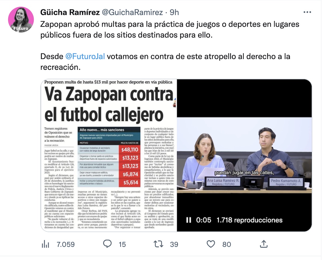 Todo esto pasó en contexto de los cambios que hicieron a la Ley de Ingresos en la actualización de las sanciones en el Reglamento de Policía y Buen Gobierno —noticia que no le cayó nada bien a regidores y regidoras como Ana Luisa Ramírez, de Futuro Jalisco, quien hizo un poco más de ruido para que esta decisión no se quedara en lo local.